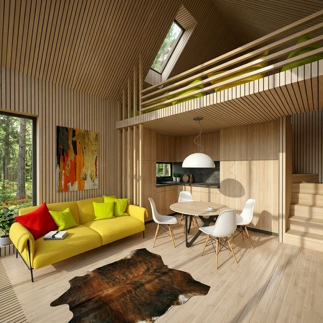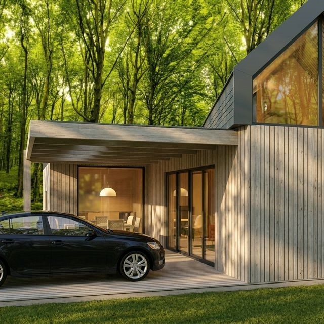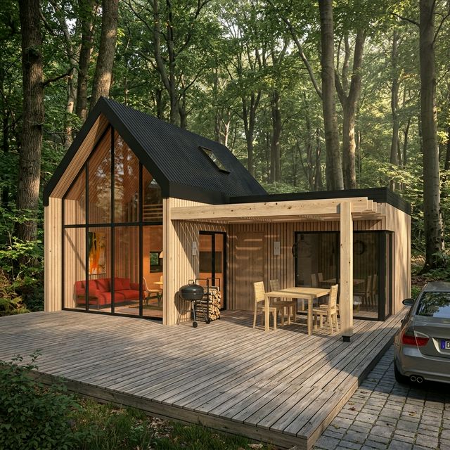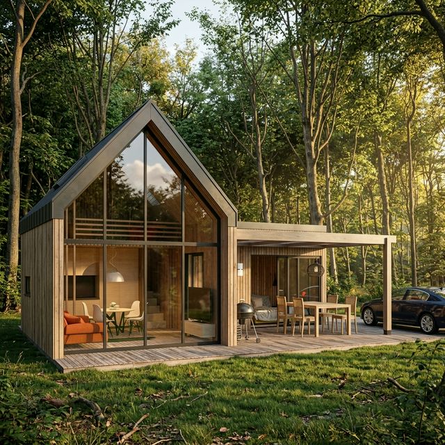 Vivienda prefabricada de diseño moderno con estructura de acero galvanizado, fachada panorámica tipo A-frame y terraza cubierta. Ideal como residencia principal, casa de campo o alojamiento turístico. Fabricación en 30 días, montaje en 5-7 días.