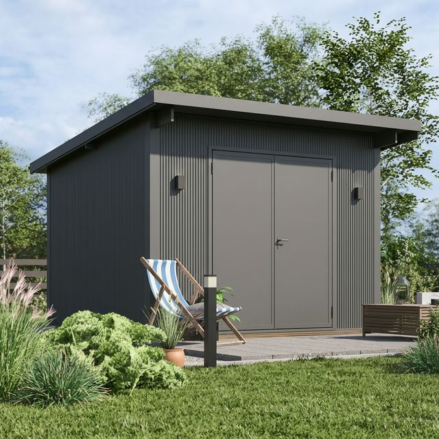 La Caseta de Jardín CSJ-002 combina un diseño contemporáneo de líneas rectas con la resistencia del acero galvanizado. Su cubierta a un agua (monopitch) y los paneles de chapa grecada le dan un aspecto moderno y minimalista que se integra perfectamente en jardines actuales. Disponible con puertas con cristalera para máxima luminosidad o con puertas macizas de acero para mayor seguridad.